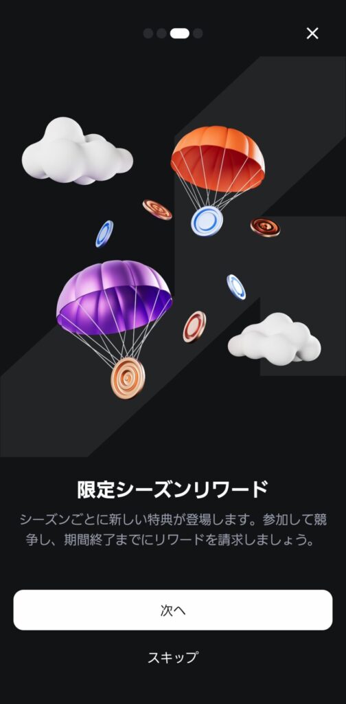 スワップやパーペチュアル取引、友達紹介など、さまざまな行動がポイントに換算され、レベルアップすると報酬を受け取ることができます。