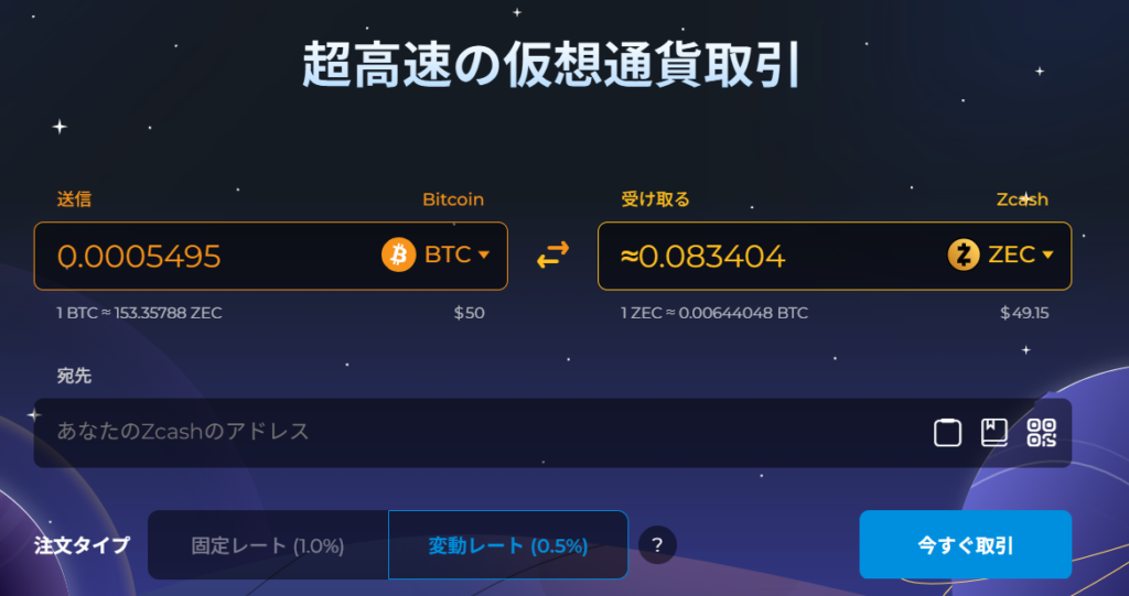 ビットコインやUSDTを送るだけで、直接ZECをウォレットに送金できます。