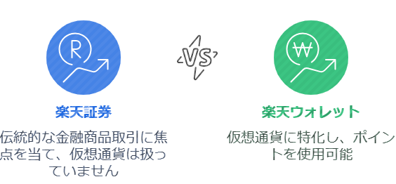 楽天ウォレットと楽天証券には明確な違いがあります。楽天証券は主に株式や投資信託などの金融商品の取引を行うためのプラットフォームであり、仮想通貨を取り扱っていません。一方で楽天ウォレットは、仮想通貨取引を専門とするプラットフォームです。
